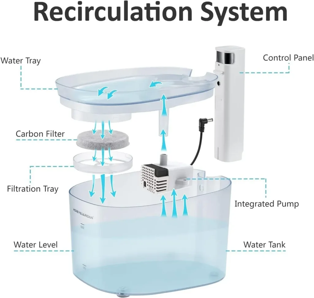 - El mecanismo patentado de recirculación de agua del Bebedero para gatos HoneyGuaridan w25, mantiene el agua siempre oxigenada y fresca.